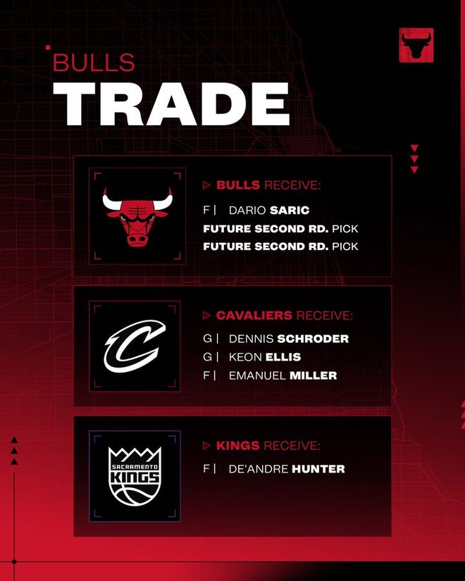公牛得到:达里奥-萨里奇、2027年次轮签、2029年次轮签