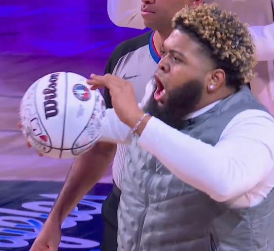 全明星队首先亮相,第一个点轻松全进,可是之后他们打铁声不断,6个点结束只拿到12分。超远三分位置,汉密尔顿投进一球,只拿到16分。全明星队投篮的最大亮点是网红传球者Druski,他给巴恩斯的一记传球像是在给奥尼尔传球,高得离谱。