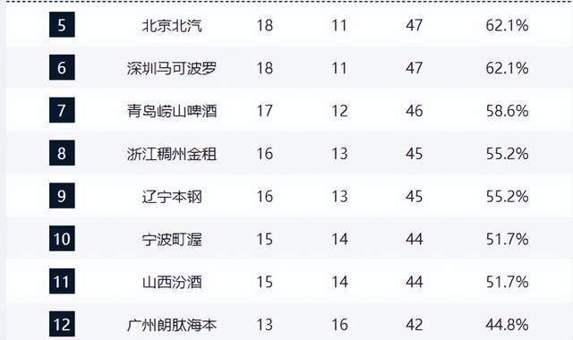 青岛队(17胜12负)与浙江队(16胜13负)分列第七、第八,季后赛门槛清晰可见。宁波队(15胜14负)与山西队(15胜14负)同分,位列第十、十一,竞争激烈。广州队(13胜16负)以微弱优势守住第十二位,成为季后赛“守门员”。北控、福建、新疆、吉林等队仍存理论晋级希望,竞争格局高度开放。