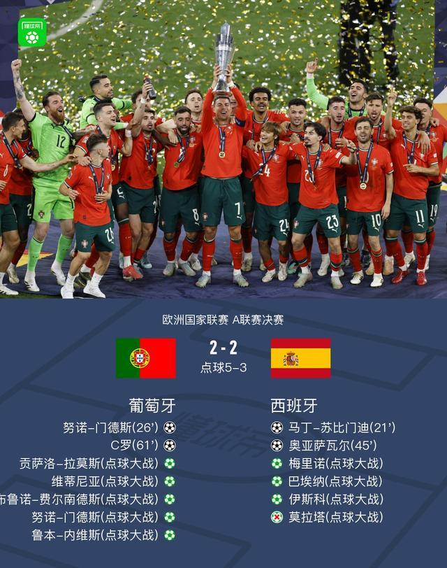 在夺得欧洲杯冠军后,西班牙一时风头无两,球队中新老结合,实力强大,面对欧国联决赛,他们势在必得,但已经拿过一次的葡萄牙并不答应,C罗的进球帮助葡萄牙进入点球大战,而点球大战莫拉塔的失点让葡萄牙再次夺得欧国联冠军,也让西班牙失去了再拿一冠的机会。
